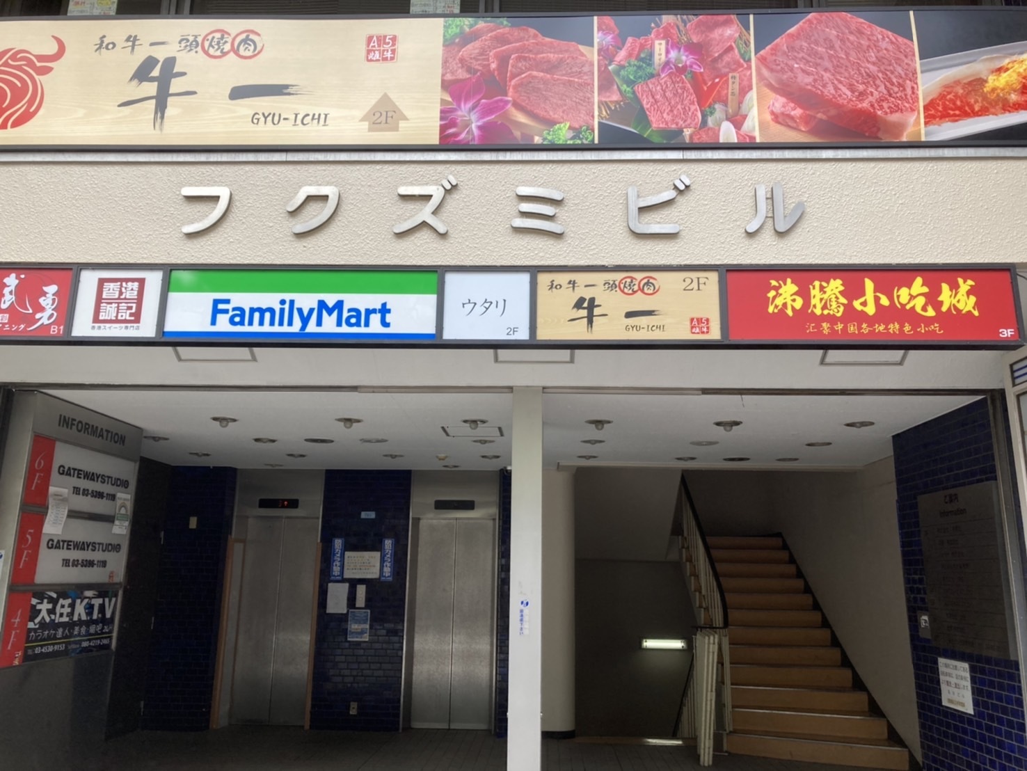 ビル入口の目印(添付画像①)にフクズミビル入り口(添付画像②)にあるエレベーターから3Fにお上がりください。